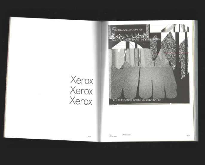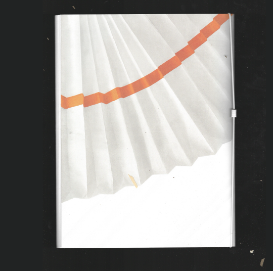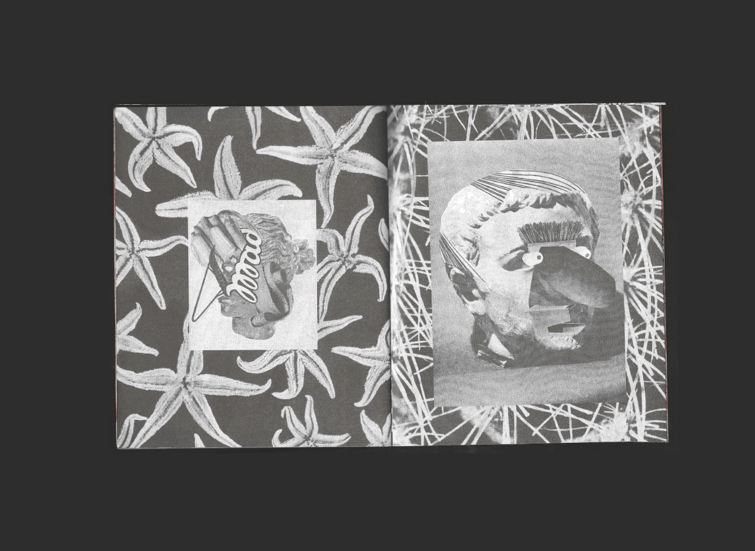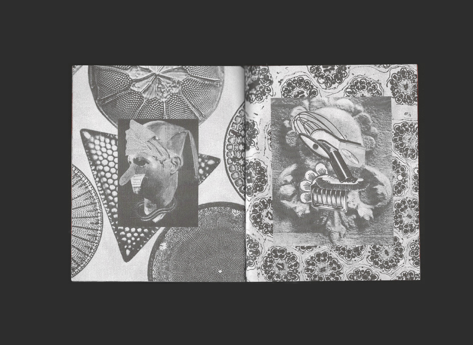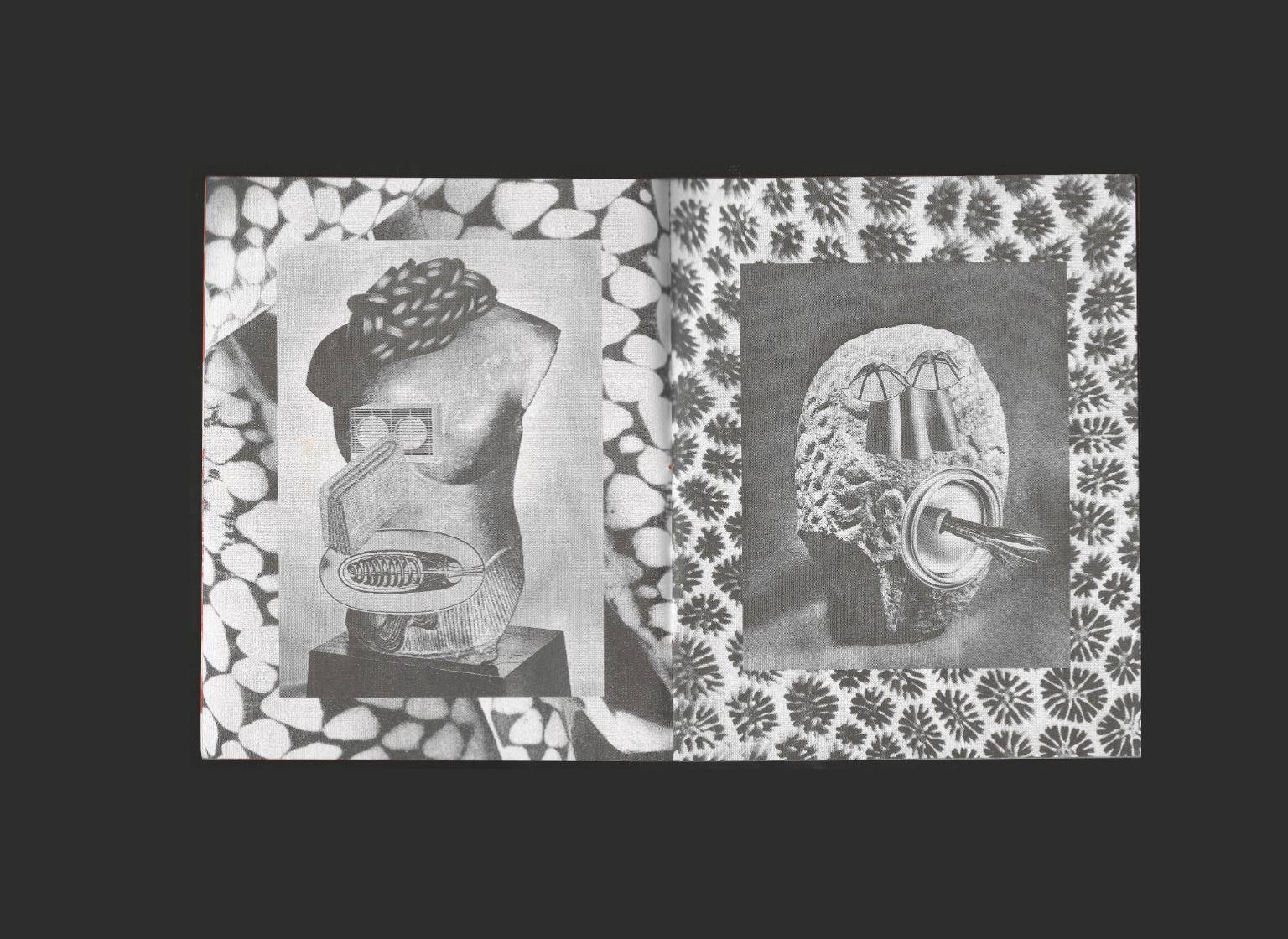 I don’t even remember where I found this one, but I was immediately drawn to its simplicity. A classic paperback format, printed in black and white on orange paper. The book revolves around collage: each spread presents a composition placed at the center, paired with a pattern derived from a completely other image.