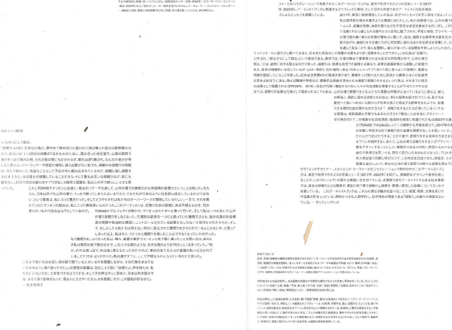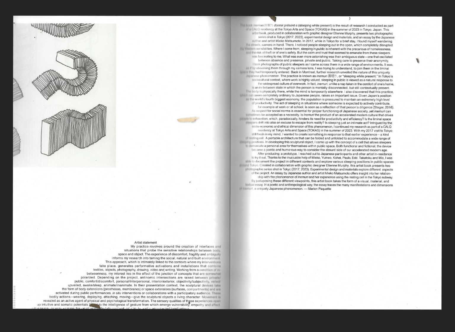 The book, Inemuri 居眠り Dormir Présent.e (Sleeping While Present), is the result of extensive research. The project explores the ethical, sociological, and economic dimensions of inemuri, the Japanese practice of sleeping in public places as a response to widespread overwork. Both functional and fictional, a portable resting cell is imagined to delimit a personal space for sleepers, right in public places.